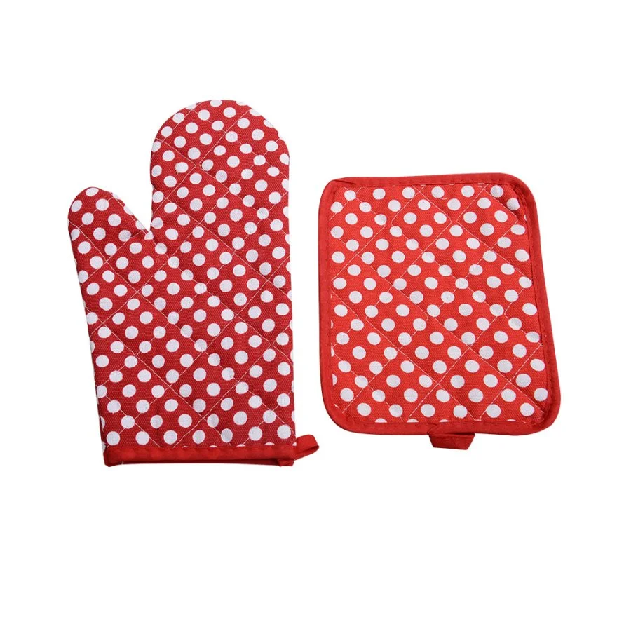 Size: oven glove 26*17cm; potholder 16x16cm Packing: 54*34*40cm/120sets, 11/10kgs Oven mitt print matches the print on the potholder and is on both sides. The trim and loop for hanging is done in the same black fabric used on the potholder.