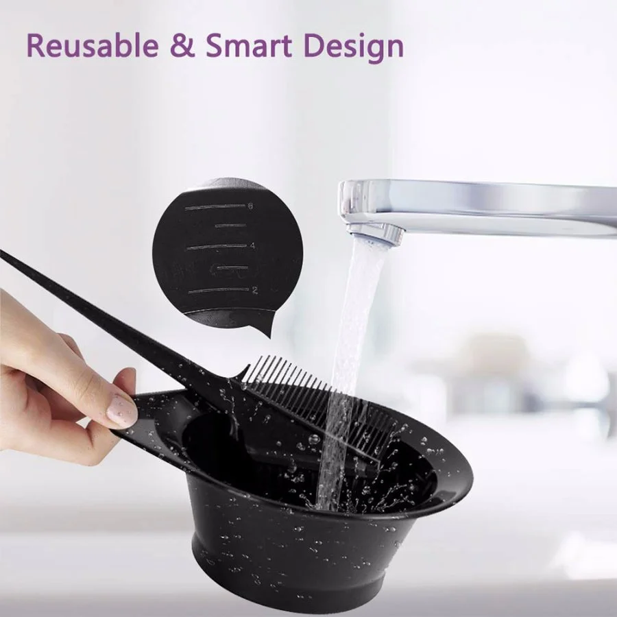Hair dye coloring kits are made of quality plastic, durable and lightweight, comfortable to handle. The hair dye set is designed in an all-black style and durable. The brush has a soft and hard bristle design to ensure smooth application of the dye.