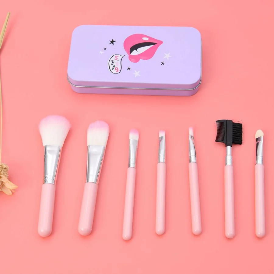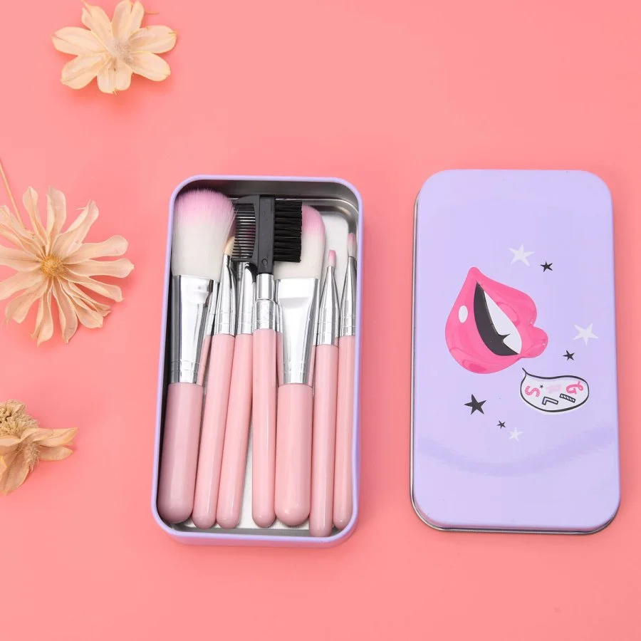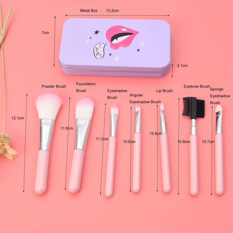 Metal Box 7PC Synthetic Makeup Powder Blush Foundation Eyeshadow Lip Brush Set